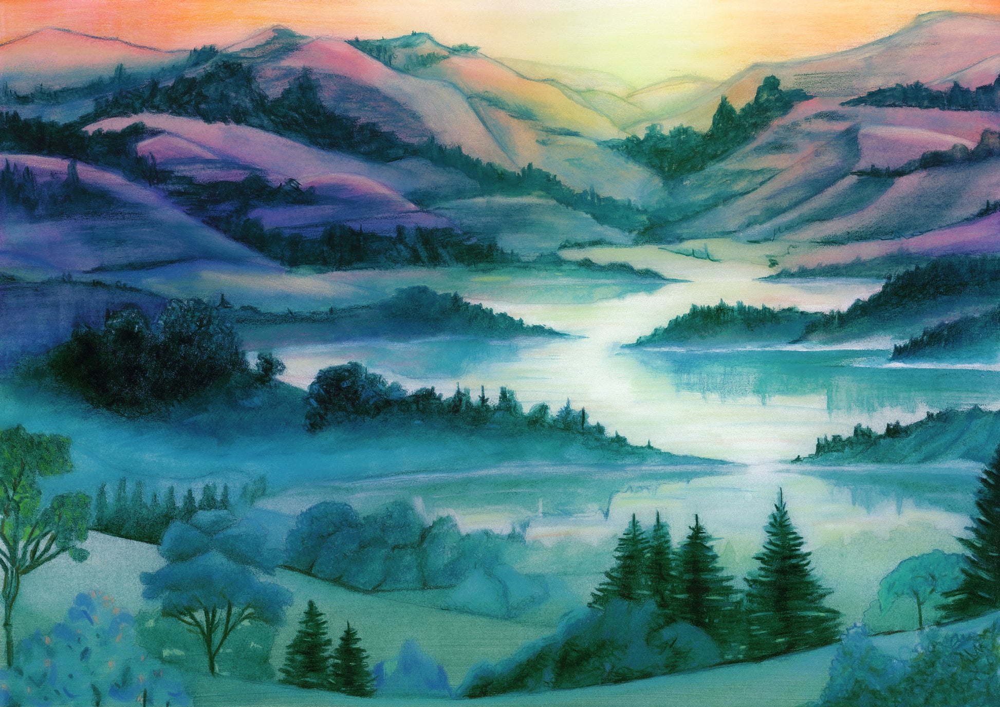 Iridescences du Soir est inspiré de la beauté des dégradés du crépuscule : des collines baignées de brume, des teintes changeantes où se mêlent verts profonds, bleus apaisés et reflets violets. Chaque nuance semble vibrer comme une onde de lumière, offrant une atmosphère à la fois mystérieuse et apaisante.